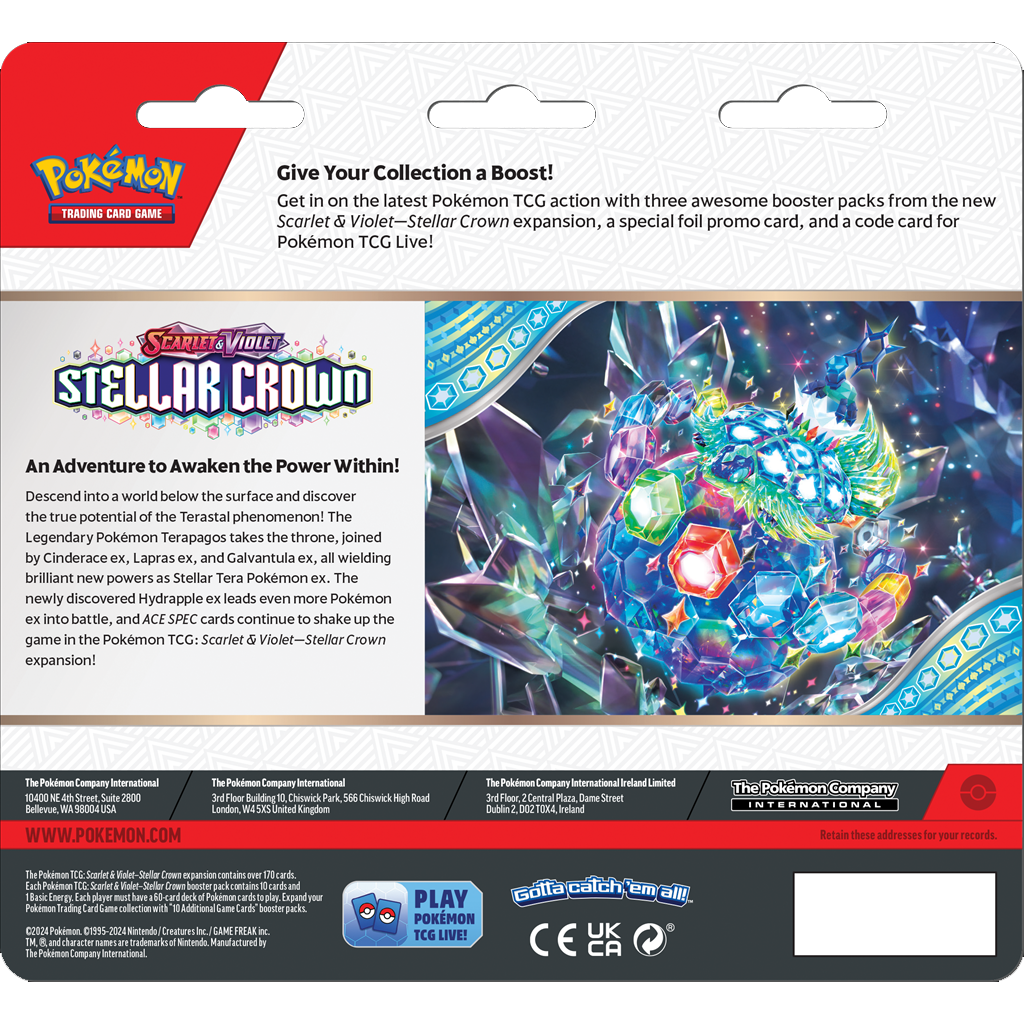 Betreed de opwindende wereld van Pokémon met beide 3-pack blisters uit de Stellar Crown set! Breid je collectie uit met nieuw ontdekte Pokémon en meer ACE SPEC-kaarten met deze 3-pack blisters.